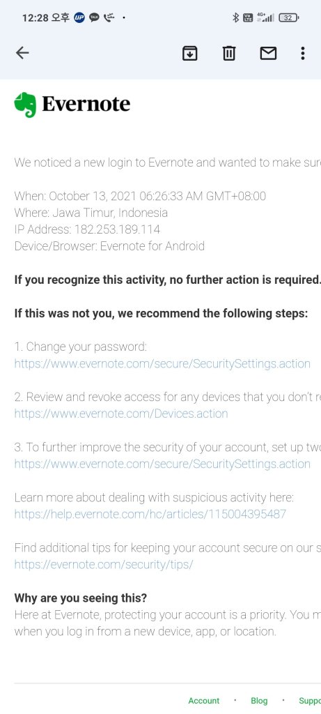 처음에는 너무 황당해서 혹시 내가 다른 월렛으로 옮기고 기억을 못 한 건가 하고도 생각해 봤습니다. 그러나 해커가 어떻게 제 월렛의 암호를 알아냈는지 모르겠지만 들어와서 코인을 인출해 간 것이었습니다. 커뮤니티의 포럼을 통해 조회해보니 유사한 일이 있었긴 한데 피싱을 당해서 월렛의 아이디와 암호를 실수로 준 것이지 저와는 다른 상황이었습니다. 가장 의심이 되는 부분은 제 에버노트인데 제가 유사시 아내에게 알려주려고 월렛 복구 암호를 적어놓은 것을 해커가 침입하여 그 정보를 가지고 월렛을 다시 복구하여 코인을 빼간 것이 아닌가 하고 생각됩니다. 복구 암호를 종이에 써놓을 것을 권장했는데 그것을 무시하고 온라인 노트에 적어놓은 것이 실수였습니다. 인도네시아에 위치한 IP주소에서 제 에버노트에 접근하려 한다는 경고 메일을 받고서야 때늦은 사태 파악을 하고 접속차단 및 암호 변경을 했습니다.