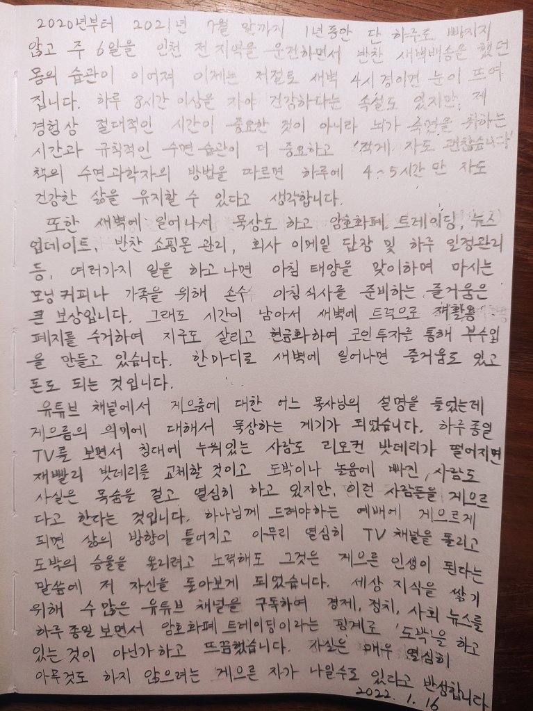 2020년 7월부터 2021년 7월 말까지 1년 동안 단 하루도 빠지지 않고 주 6일을 인천 전 지역을 운전하면서 박찬 새벽배송을 했던 몸의 습관이 들어 이제는 저절로 새벽 4시 경이며 눈이 뜨여집니다. 하루 8시간 이상을 자야 건강하다는 속설도 있지만 제 경험상 절대적인 시간이 중요한 것이 아니라 뇌가 숙면을 취하는 시간과 규칙적인 수면 습관이 더 중요하고 ‘적게 자도 괜찮습니다’ 책의 수면 과학자의 방법을 따르면 하루에 4-5시간만 자도 건강한 삶을 유지할 수 있다고 생각합니다. 또한 새벽에 일어나서 성경 말씀 묵상도 하고 암호 화폐 트레이닝, 뉴스 업데이트, 반찬 쇼핑몰 관리, 회사 이메일 답장 및 하루 일정관리 등, 여러가지 일을 하고 나면 아침 태양을 맞이하며 마시는 모닝 커피나 가족을 위해 손수 아침 식사를 준비하는 즐거움은 큰 보상입니다.