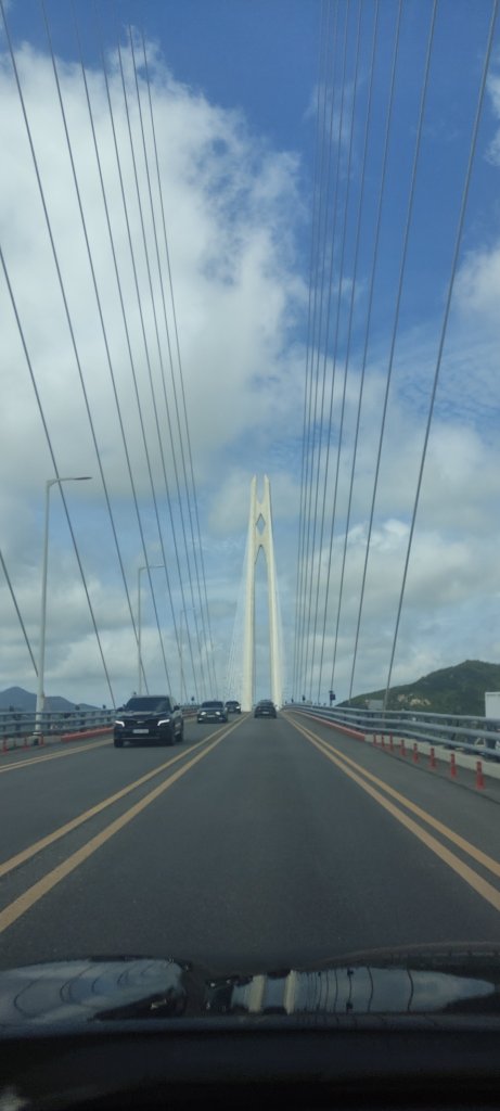 다음날은 8.15 광복절이라 미리 준비해 온 태극기를 들고 사진 포즈를 취하고 곧 자은도로 출발했습니다. 과거에는 섬이라 배를 타고 들어가야 하는 곳이었지만 2019년에 완공된 천사대교를 통해 자동차로 쉽게 들어갈 수 있는 섬이 되었습니다. 신안군에는 1004개의 섬이 있다고 해서 천사대교로 이름을 지었다고 합니다.