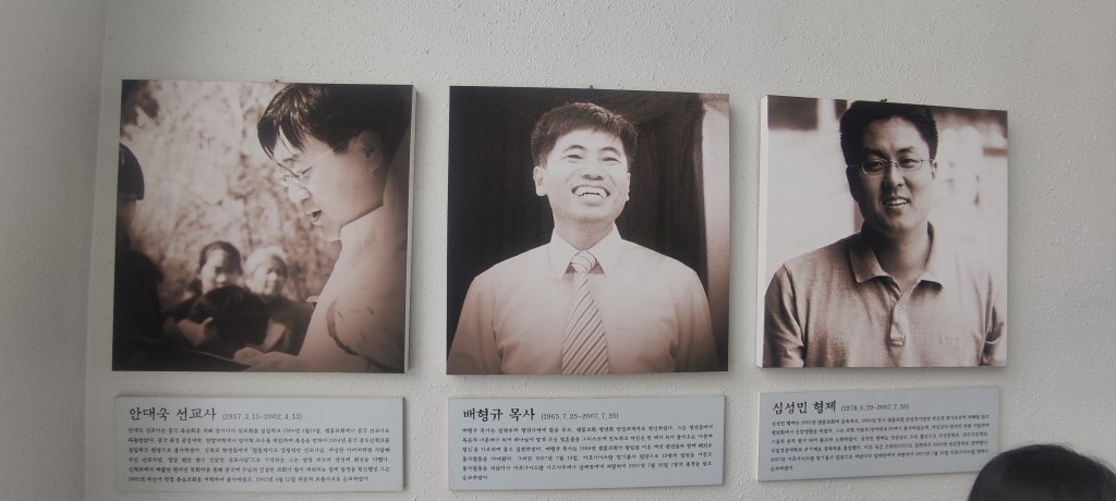 I went to take a picture as a souvenir, and I noticed three framed photos hanging on the wall in the stairwell. They were of pastors and members of the church who had met untimely deaths at a young age or while on mission trips. There was also a brother who had been kidnapped and killed by the Taliban, a militant group in Afghanistan that I barely remembered because it was so long ago. I remember watching this event and feeling a mixture of anger at the state’s inability to rescue its citizens and blame on the church for sending a mission trip to a dangerous area with terrorists. At the time, I was in a Korean-American church in the U.S., and the senior pastor also expressed his disappointment that the church had been so reckless in traveling in a large bus to a dangerous mission field.